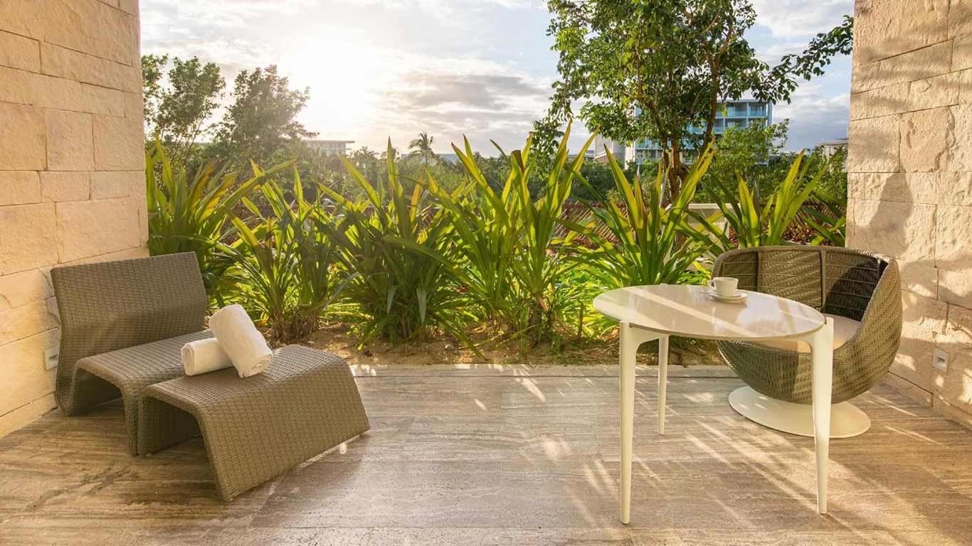 The fabulous Lagoon / Garden View Junior Suite at Grand Palladium Costa Mujeres Resort & Spa features a furnished balcony and views of the mangrove forests or lagoon. It offers a combined living area, sofa bed and hydro-massage bath.